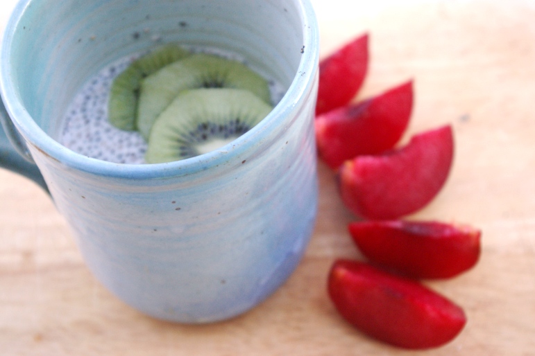 Au moment de manger le pudding, sortez le du frigo, mélangez bien pour que le mélange soit homogène et n’ait plus de grumeaux, et agrémentez de fruits coupés (ici kiwi et prunes), de quelques pépites de granola ou encore de coulis de fruits maison (miam).